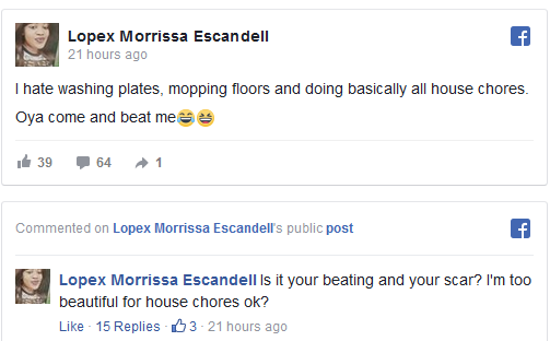 Remember the young lady who confidently came out to reveal that if her lover does not beat her in a day she would not be alright? Yes, Lopex Morrissa Escandell is at it again!