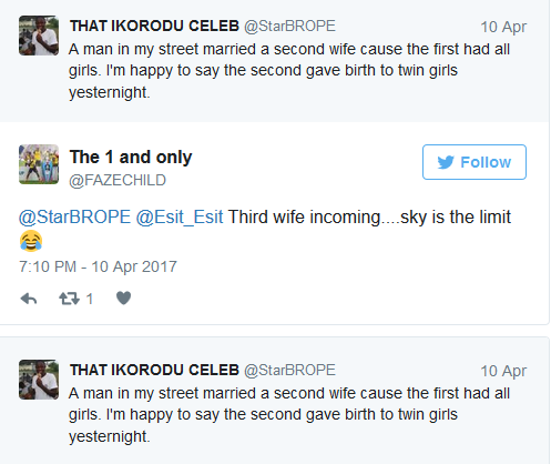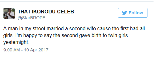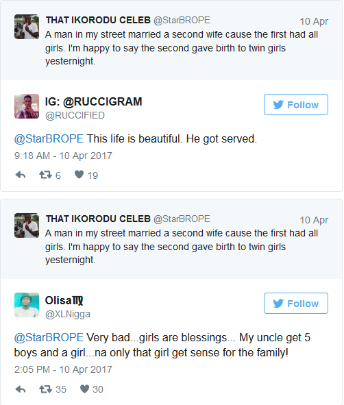 The tweet generated lots of reactions as people could not get past why a man would put the blame of not having a male child on his wife in this present age and time.