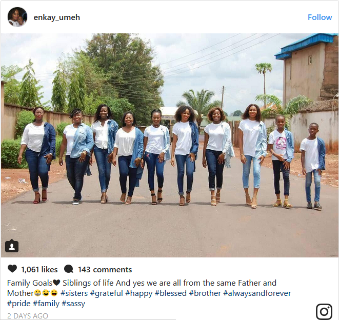 According to the picture posted on her page, Enkay, all the nine girls and one boy whom happens to be the last born were seen, in white tops/shirts and blue jeans. The picture was obviously taken on the road and they all lined up according to how they were born.