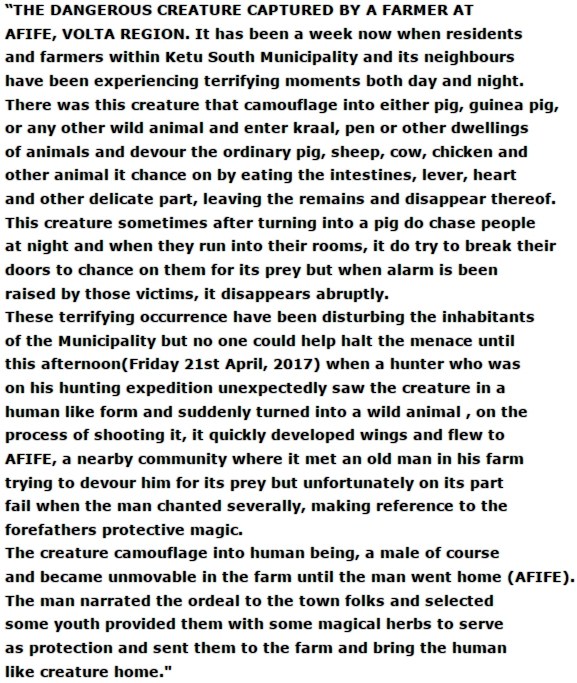 It was gathered that the monster who often changes into pigs and many other terrible animals to terrorise residents of the Volta region of Ghana was caught a week after it was first sighted by concerned residents.