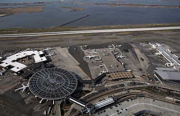 Two men were arrested at New York’s John F Kennedy Airport and photos show them with large packs of white powder taped to their legs and torsos.
