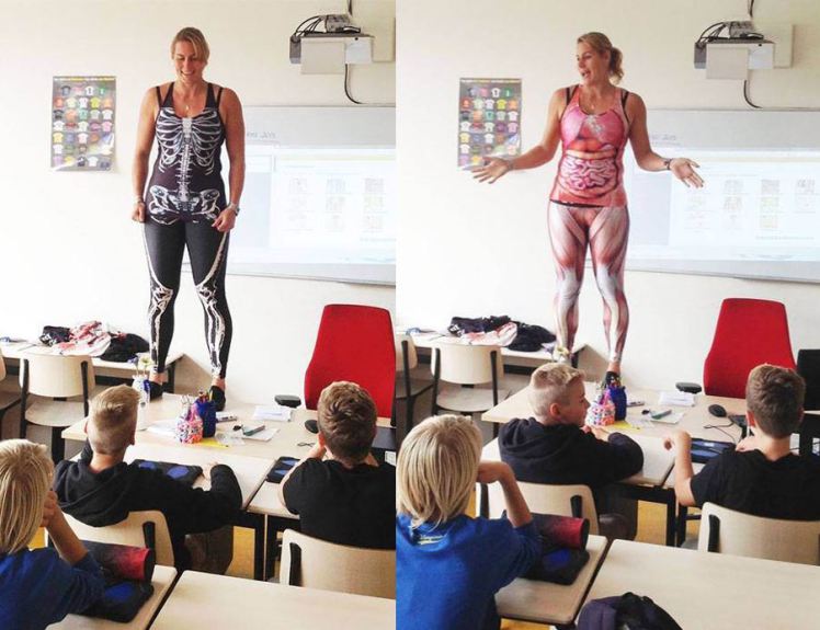 In a recent lesson, she got up on a desk at the front of the classroom and stripped off…to reveal an anatomically-correct spandex suit, showing where all the organs of the body are found.