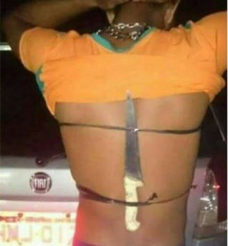 Police Operatives got the shock of their lives when during interrogation, a fully loaded gun and a knife, were found strapped to her body.