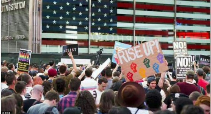 Others marched on foot outside the White House bearing signs which read ‘we’re here, we’re queer,we hate the f****** president’.