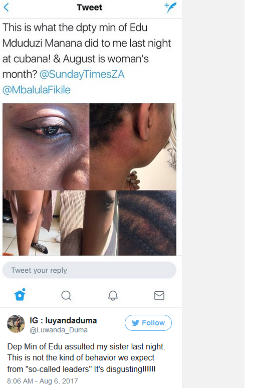 A post on Twitter shows the injuries that Ms Duma allegedly sustained during Saturday night’s altercation at the club in Fourways, near the main city Johannesburg: