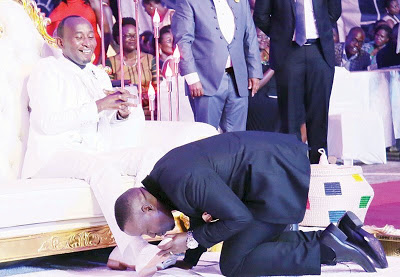A Ugandan prophet Elvis Mbonye, who sat on a luxurious couch and watched with glee as congregants flocked to kiss his expensive designer shoes, has caused a stir on social media after photos surfaced.