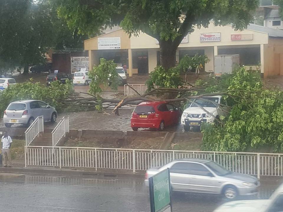 Heavy downpour mixed with strong winds Thursday afternoon caused considerable damage to property that includes offices, vehicles and roads.