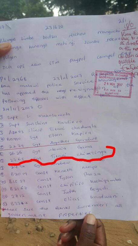 “The Malawi police management has approved the resignation of the following police officers with effect from 24 November 2017,” reads in part the letter.