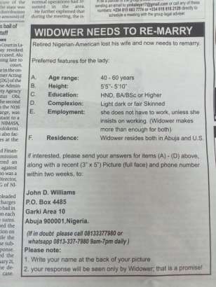 A Nigerian-American widower who intends to re-marry has placed an advert in a Newspaper, which saw him make a list of features he expects from a would-be wife.
