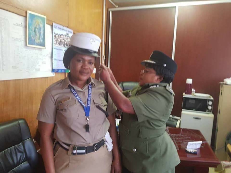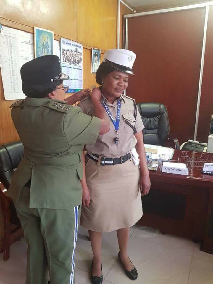 In the pictures, Zambian Commissioner of Police in charge of Administration Ms. Lombe B.Kamukoshi decorates the Officer with her new rank.