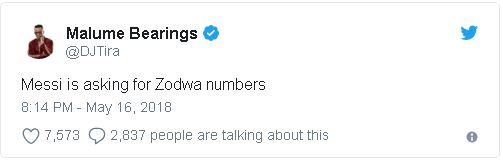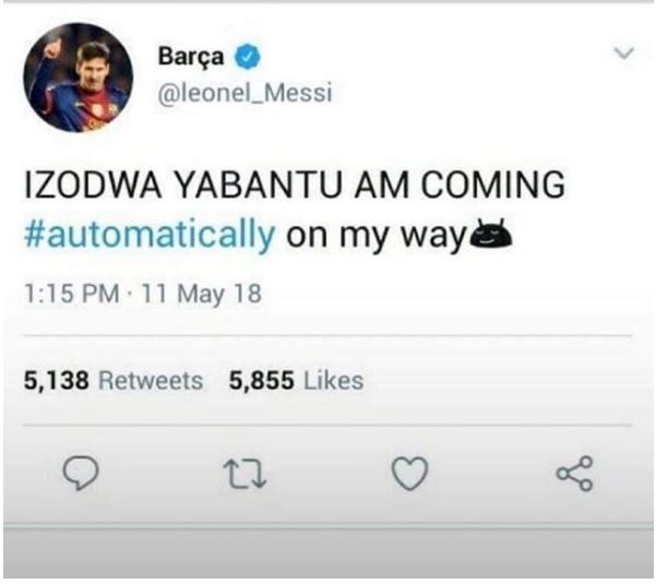 The joke was started by a fake Messi twitter account which tweeted in Zula language “IZODWA YABANTU AM COMING #automtaically on my way.”