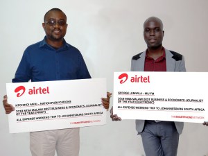 The sponsored Top Business Reporter award from Airtel Malawi includes return Air tickets to Johannesburg South Africa, accommodation at the 4 star Park Inn hotel in Sandton, a half day jo’burg tour and spending money for the award recipients. Lumwila and Meki will depart for Johannesburg South Africa today (Friday 13th July) and will return on Sunday.