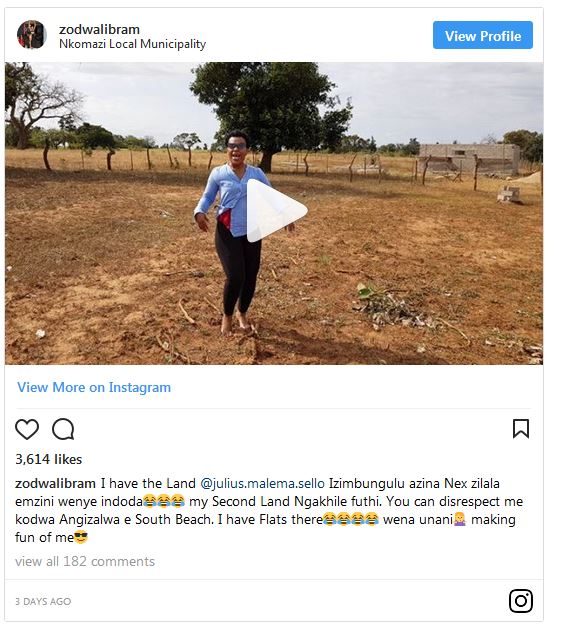 Taking to social media Zodwa revealed that she had been investing her hard earned money in property in a Zulu caption loosely translated to “I have the Land @julius.malema.sello bed bugs have nothing, they sleep in someone else’s home, this is my second land and I’m building again. You can disrespect me but I don’t hail from south beach. I have Flats there, and you? What do you have? Making fun of me”