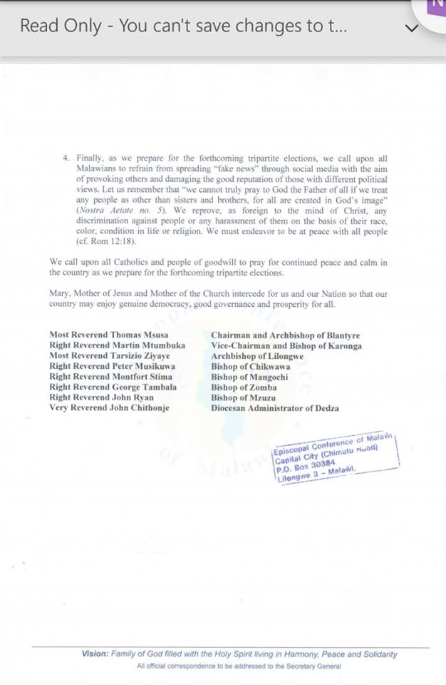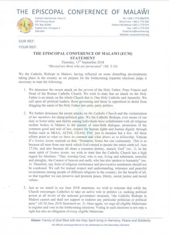 Catholic Bishops under the banner of the Episcopal Conference of Malawi (ECM) have attacked the ruling Democratic Progressive Party (DPP) for dragging the head of Roman Catholic Pope Francis into party politics.