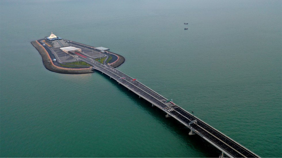 About 30km of its total length crosses the sea of the Pearl River delta. To allow ships through, a 6.7km section in the middle dips into an undersea tunnel that runs between two artificial islands.