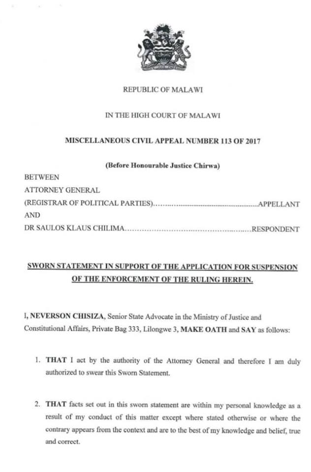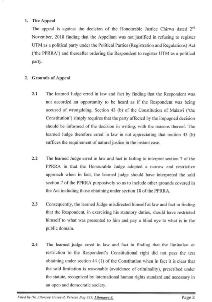 Government through the Attorney General and Registrar of Political Parties has appealed to the Supreme Court of Appeal against a High Court ruling that UTM be registered within seven days from the date of their application.
