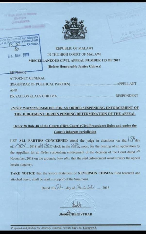 UTM lawyer, Michael Goba Chipeta, says he has been served with notice but maintains that the appeal does not stop the Registrar from complying with the High Court order to register UTM as a Party.