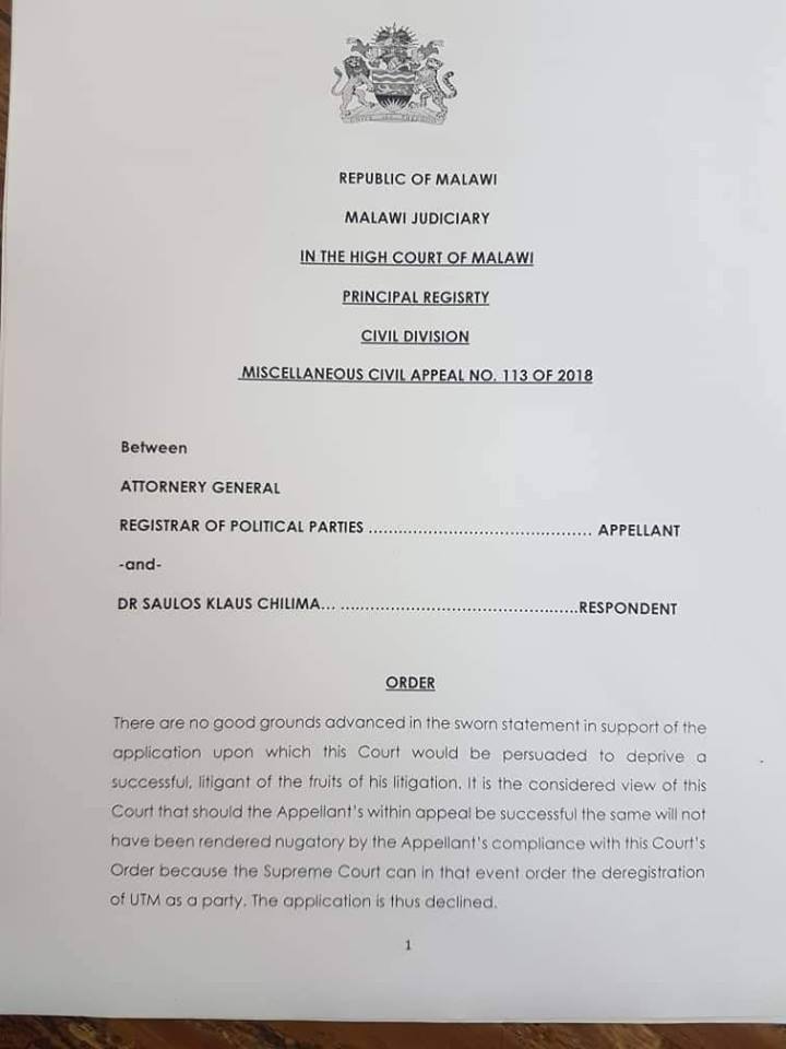 The High Court in Blantyre has thrown out the application by the Attorney General and the Registrar of Political Parties to appeal against the registration of UTM as a political party in the Supreme Court.