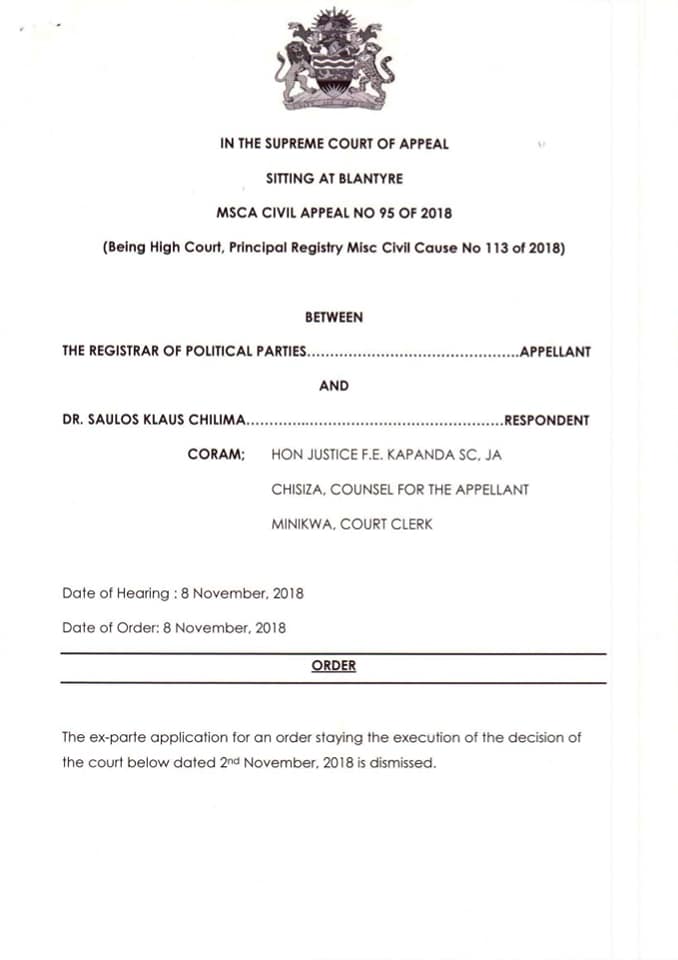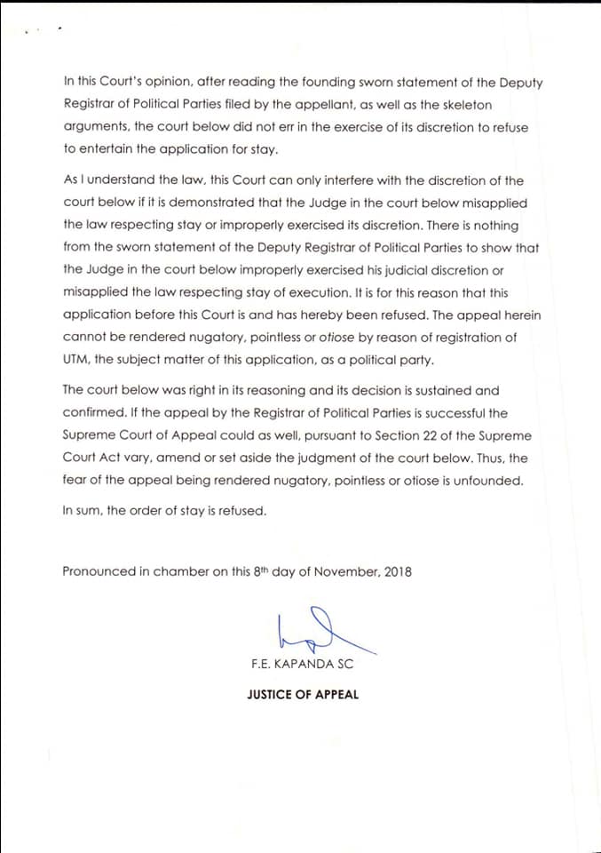 Newly appointed Attorney General Kalekeni Kaphale filed the application on Thursday asking the Supreme Court of Appeal to effect a stay order against the High Court ruling made on 2nd November this year that ordered the Registrar of Political Parties to register UTM by today.