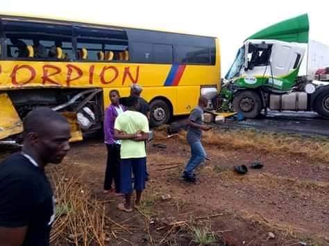 The two involved vehicles collided head-on after a Zhong Tong bus registration number AIB 7262 which was being driven by Mr Alex Mwape failed to keep to his side lane and was hit by an oncoming truck and trailer.