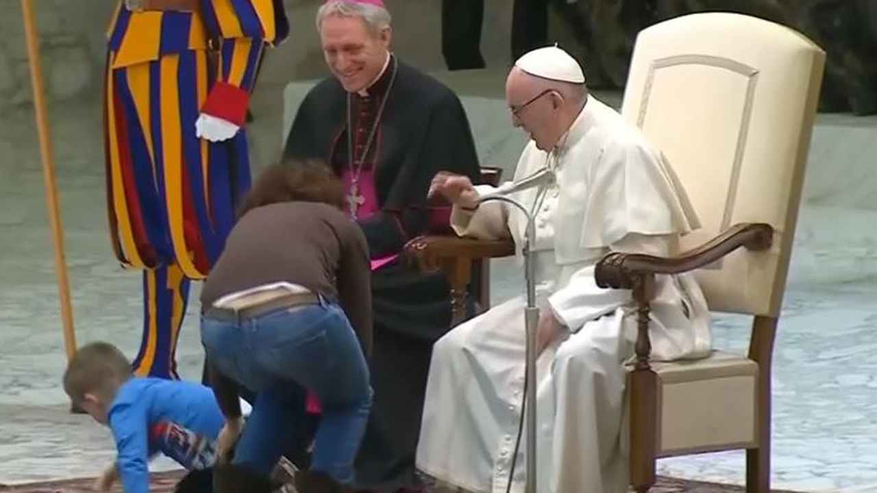 Pope Francis was addressing the packed hall as the boy freely walked up the marble stairs towards him.