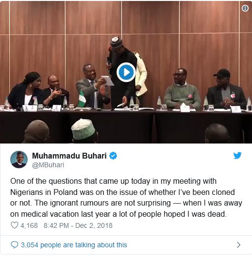 “One of the questions that came up today in my meeting with Nigerians in Poland was on the issue of whether I’ve been cloned or not,” Buhari said. “The ignorant rumors are not surprising — when I was away on medical vacation last year a lot of people hoped I was dead.”