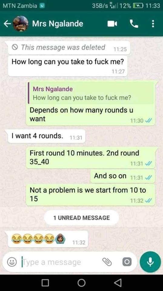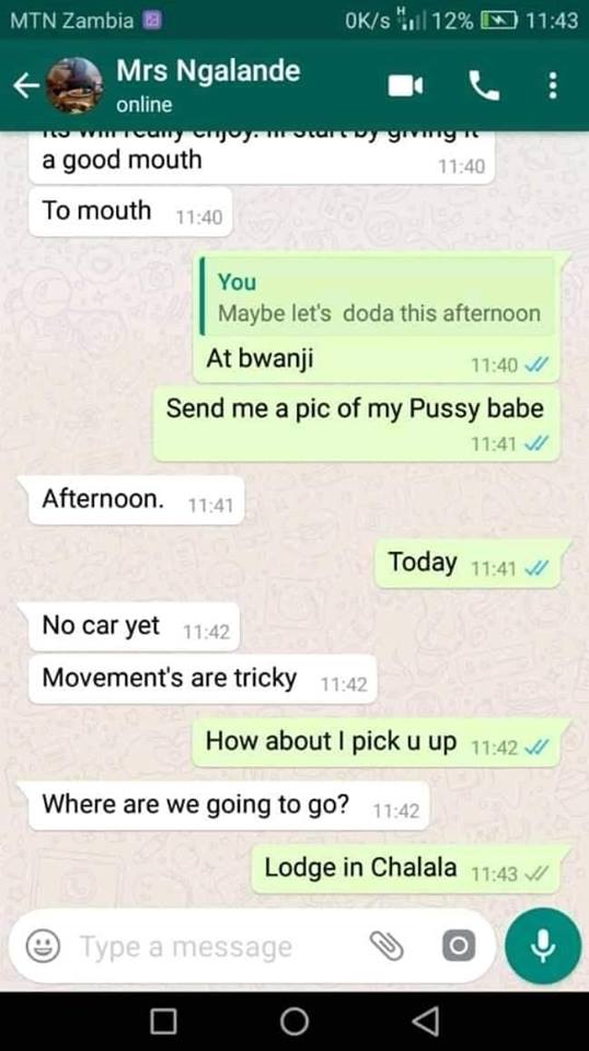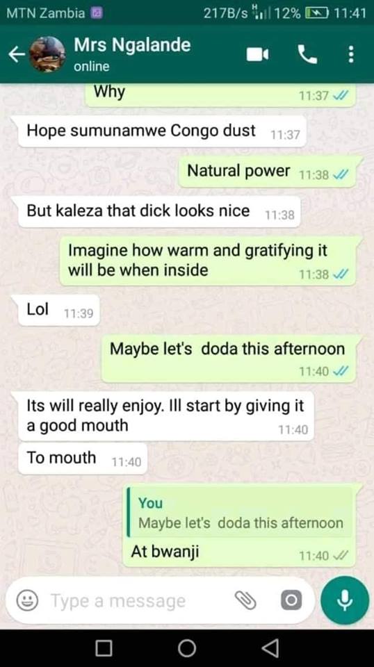 According to ZambianObserver, the woman Mrs Ngalande and the unknown man have been sending nudes and sex messages planning their move to meet and have sex.