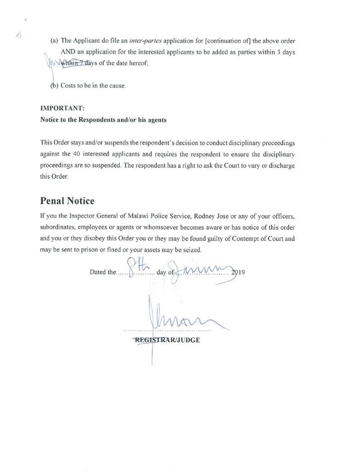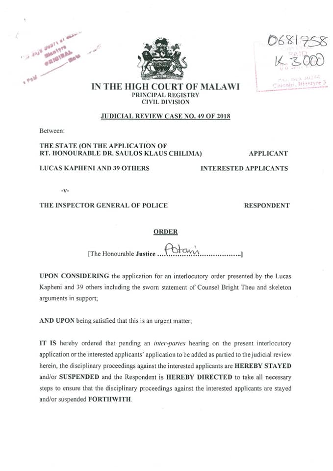The High Court in Blantyre has ordered the Inspector General of Police Rodney Jose to suspend disciplinary proceedings on 40 law enforcers who are said to be absconding work.