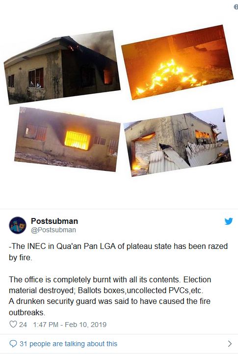 “The INEC office in Qua’an Pan has been engulfed by fire causing a setback for the preparations for the general elections in the Local Government Area,” the official wrote.