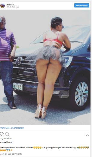 Zodwa was wearing her signature high heels and a black see-through tutu that left nothing to the imagination and a red bra. She was captured learning against a black VW, while the man looked at her like a meal he wanted to devour.