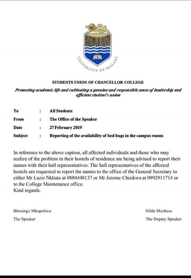 “In reference to the above caption, all affected individuals and those who may realize of the problem in their hostels of residence are being advised to report their names their hall representatives. The hall representatives of the affected hostels are requested to report the names to the office of the General Secretary to either Mr. Lazie Nkhata,” reads in part the memo.