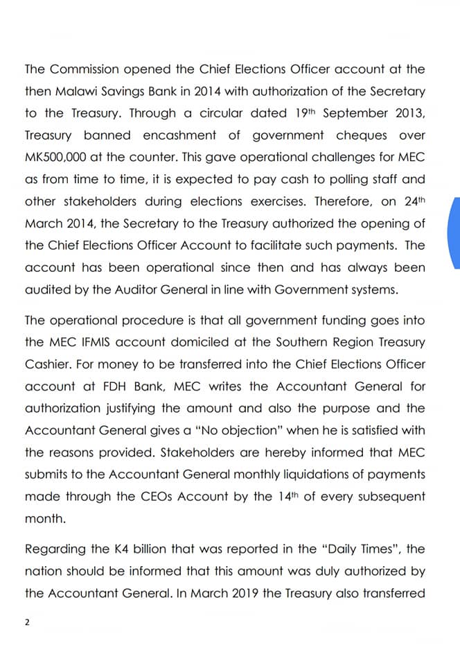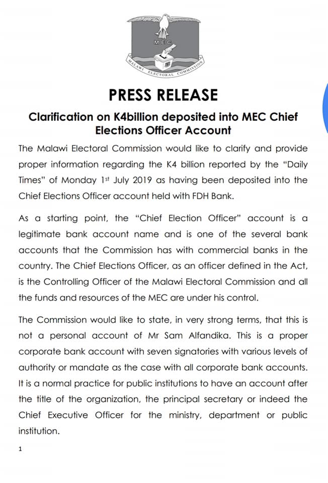 The Malawi Electoral Commission (MEC) has come out with guns blazing defending an account it holds at FDH Bank named Chief Elections Officer Account, after a story in Monday’s Daily Times revealed that K4 billion was transferred into the account on the eve of May 21 Tripartite Elections.