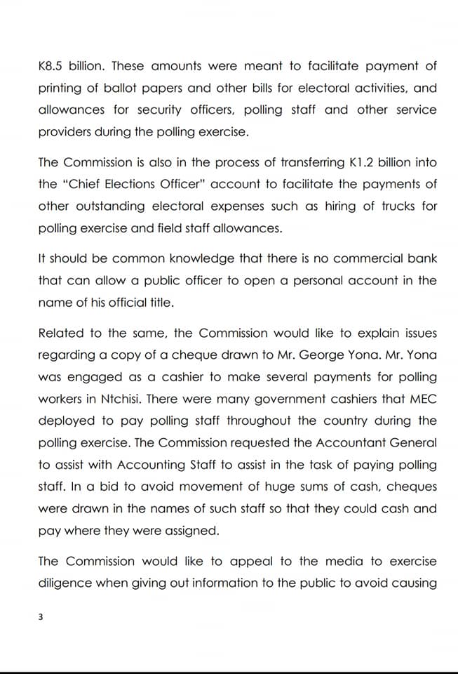 According to a statement released by the commission’s director of media, Sangwani Mwafulirwa, reacting to a story, the account was opened in 2014 on the Treasury’s advice to ease transaction of funds above K500 000 following the 2013 ban on transfers of funds over the said amount. The circular has also disclosed that in March this year the Treasury transfered K8.1 billion to the account for elections operations.