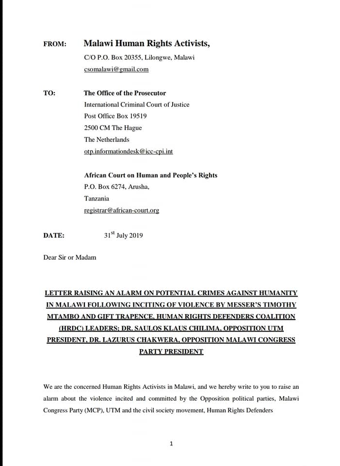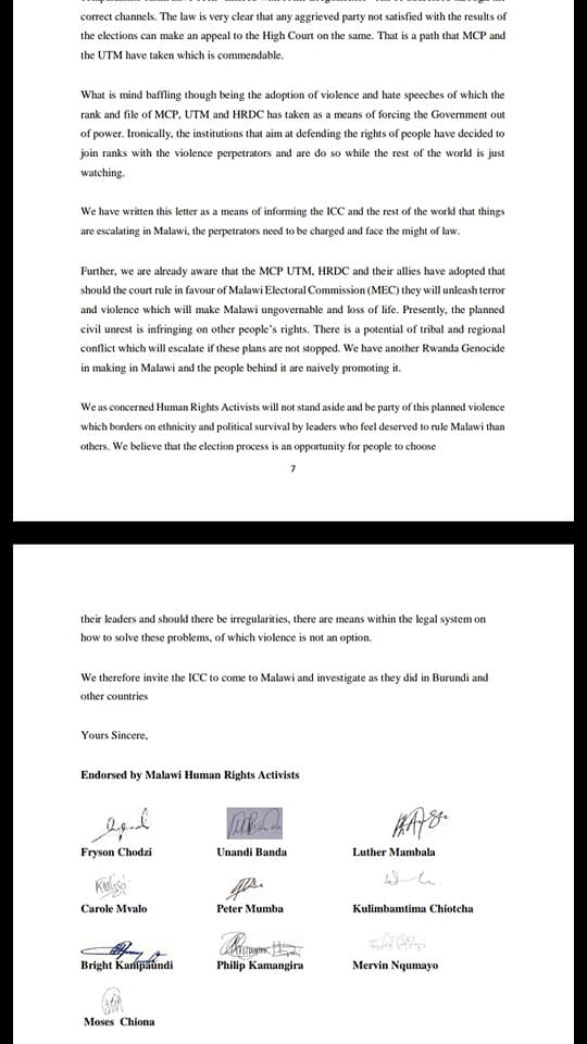 “We write this letter to you inform you ICC and the rest of the World that acts of violence are escalating in Malawi in a guise of exercising human rights, the perpetrators need to be charged and face the mighty law,” reads in part the letter.