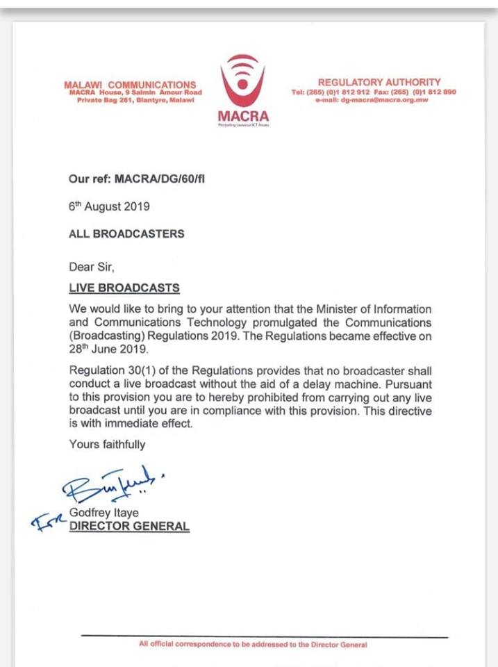 in the statement signed by MACRA Director General Gofrey Itaye, Macra has said no media house is allowed to carry any live broadcast of any program until they in compliance of the provision.