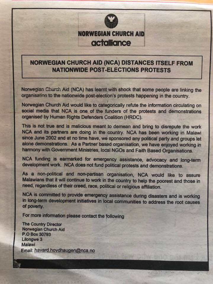 Norwegian Church Aid (NCA) has distanced itself from rumours hovering on the social media that the organisations is funding the ongoing demonstrations organized by Human Right Defenders Coalition (HRDC) aimed at forcing Malawi Electoral Commission (MEC) Chairperson Dr. Jane Ansah.