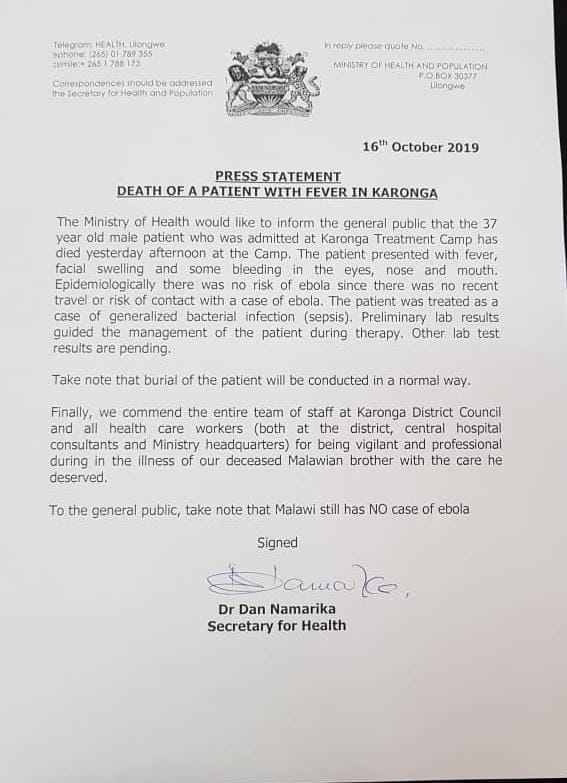 The Ministry of Health and Population has confirmed the death of patient suspected of having ebola infection admitted at Kapolo Health Centre in Karonga.