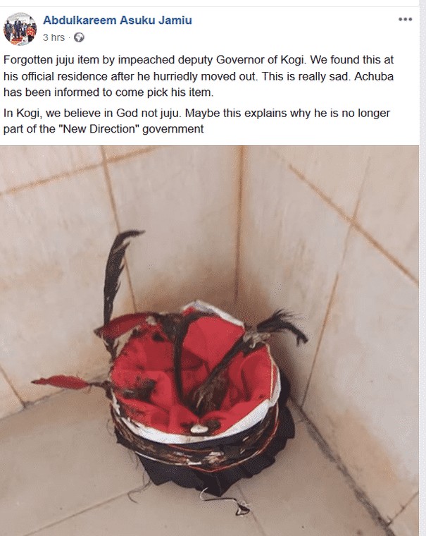 ”Forgotten juju item by impeached deputy Governor of Kogi. We found this at his official residence after he hurriedly moved out. This is really sad. Achuba has been informed to come pick his item.