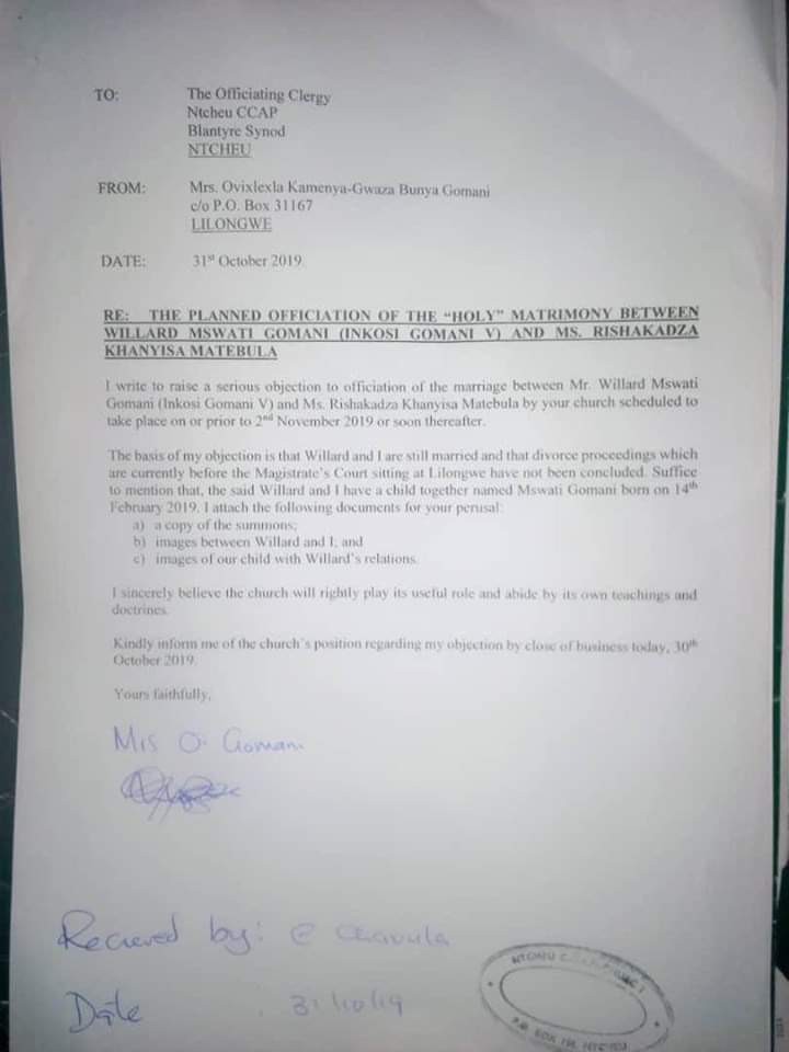 “The basis of my objection is that Willard and I are still married and that divorce proceedings which are currently before Magistrate’s Court and I have Child together named Mswati Gomani born on February 14, 2019,” reads in part the letter addressed to the Church.