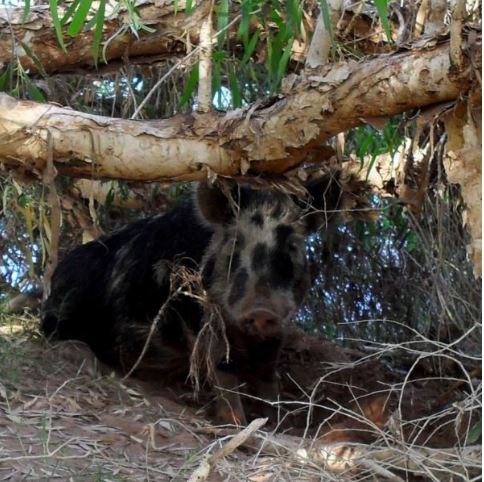 “It was in the middle of the night, and it was these people opposite of us and I heard this crunching of the can, and they got their torch out and shined it on the pig and there he was, crunching away at their cans.”