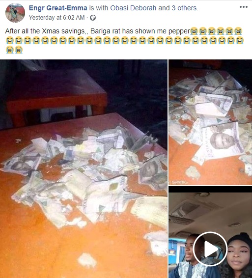 Sharing photos of the 1,000 Naira notes destroyed by rats, Engr Great-Emma wrote on Facebook: “After all the Xmas savings, Bariga rat has shown me pepper.”
