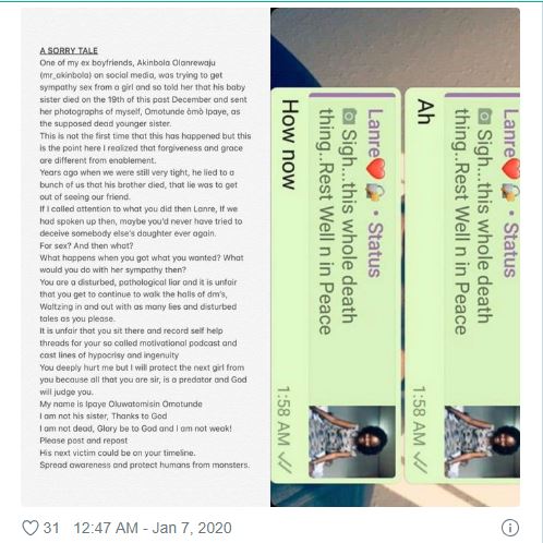 A Nigerian man identified as Mr. Akinbola has been called out for lying about his ex girlfriend being dead in order to get his crush to sympathize with him and hopeful, give him the desired attention.