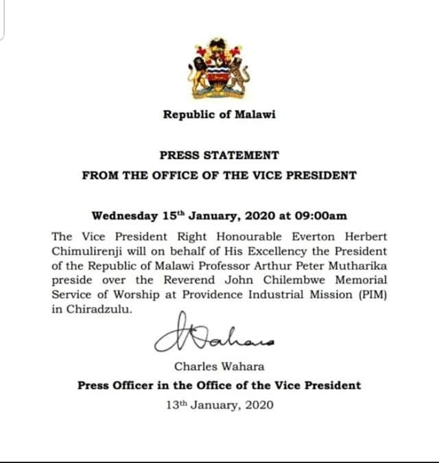 President Peter Mutharika has delegated Vice president Everton Chimulirenji to preside over the Reverend John Chilembwe memorial service slated for Thursday January 15.