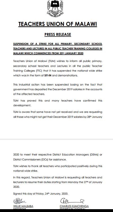“Teachers Union of Malawi (TUM) wishes to inform all public primary, Secondary school teachers and lecturers, in all the public Teacher Training Colleges (TTC) that it has suspended the national wide strike which was in the form of SIT-IN and demonstrations,” reads in part the statement.