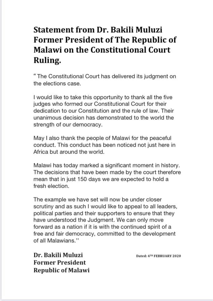 Malawi’s former President Bakili Muluzi has hailed the constitutional court’s determination to nullify presidential election results that ushered Peter Mutharika into second term as President.