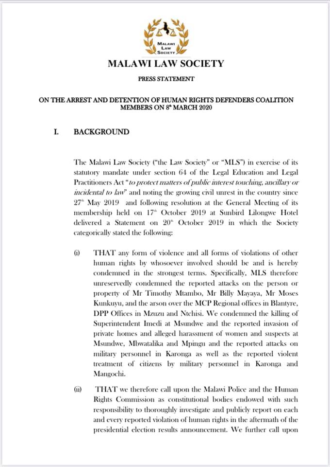 In a press statement made available to Face of Malawi Reporter MLS has shared another point of view as the society has condemned the arrests of the HRDC leaders.