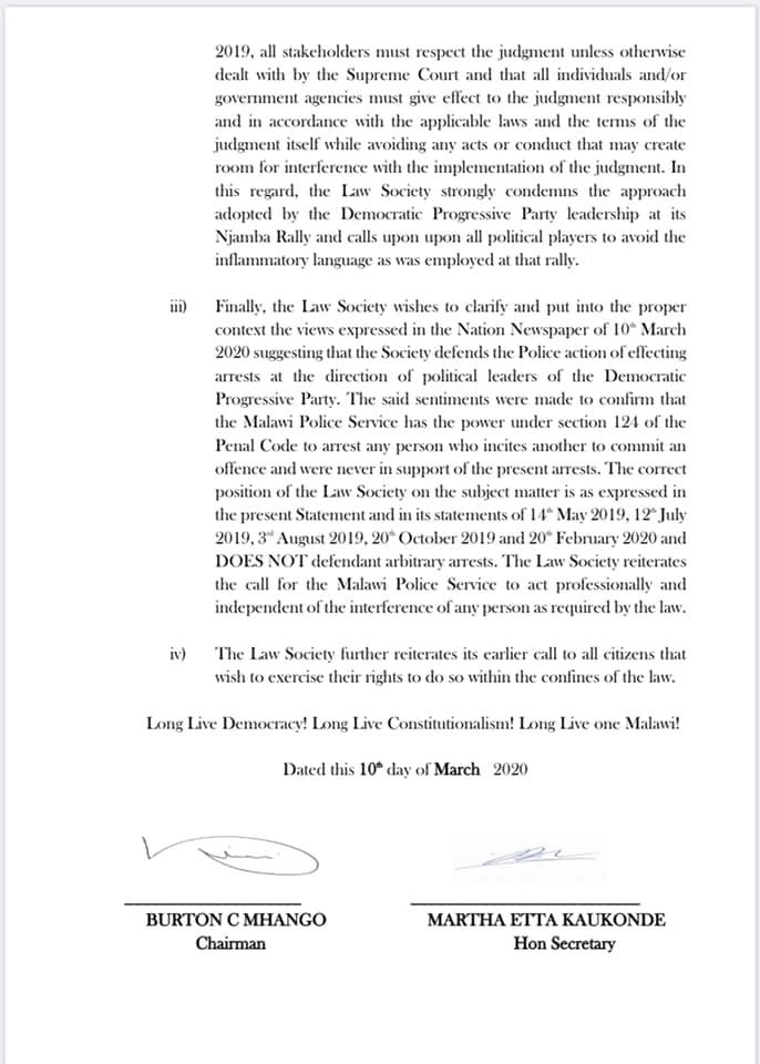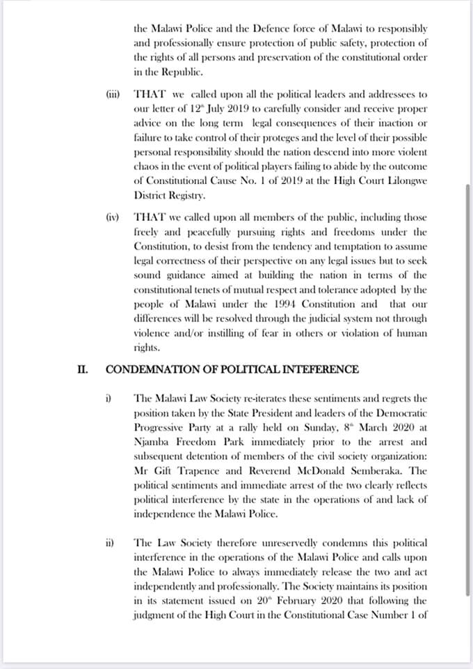 “The Law Society therefore, unreservedly condemns this political interference in the operation of the Malawi Police and calls upon the Malawi police to immediately release the two and act independently and professionally,” reads the statement.