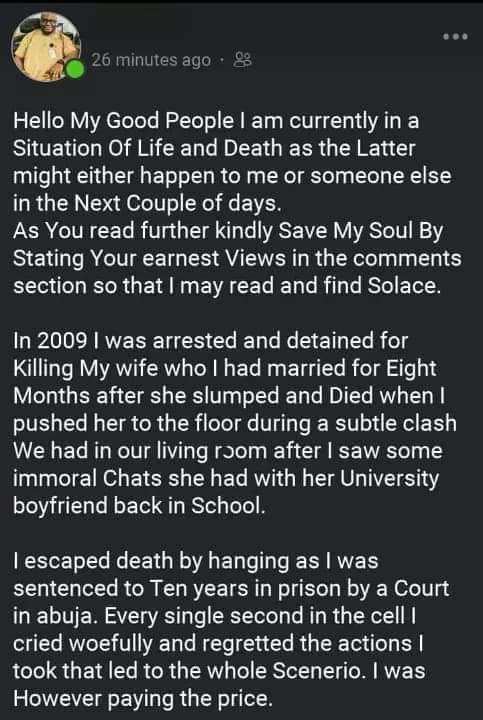 From what can be seen in his post, he had spent ten years jail term for killing his wife after an argument ensued between the both of them.