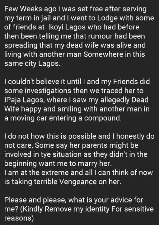 On completion of his jail term, he came out of prison to discover that the wife was not just alive, she had also gotten married to another man.