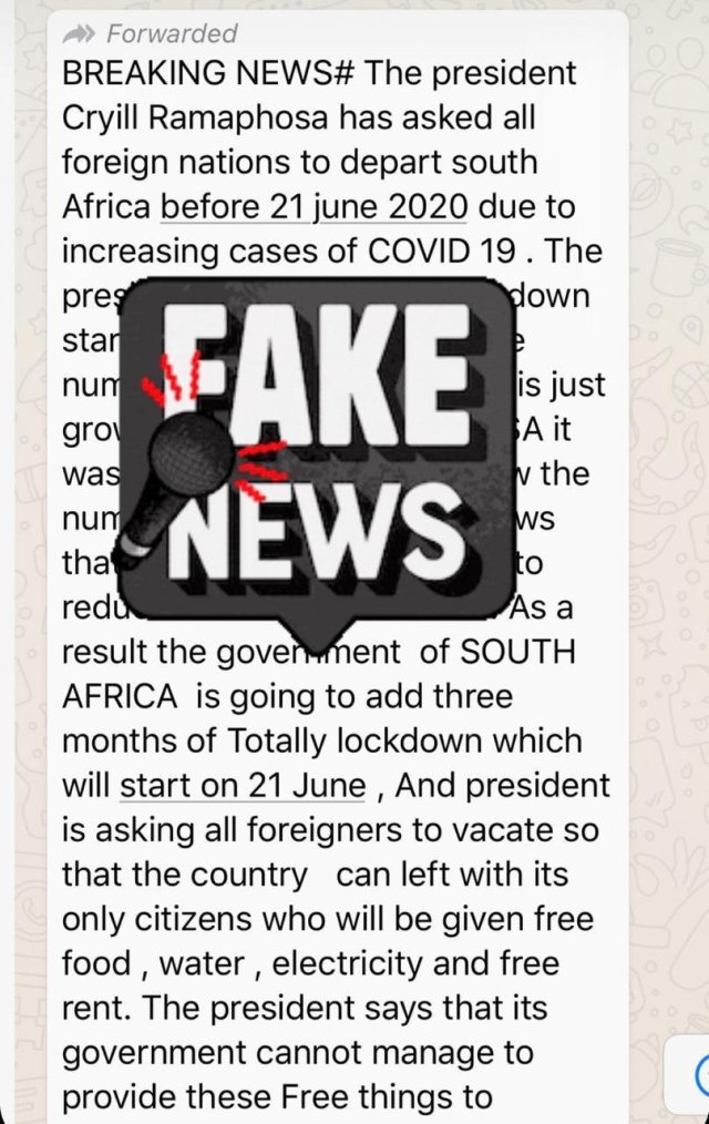 FAKE NEWS ALERT !!! President @CyrilRamaphosa has NOT asked foreign nationals to leave South Africa. The President has NOT said the #lockdown will be extended by the “ government of South Africa “ by three months, starting on 21 June . “. The WhatsApp post below is fake news.